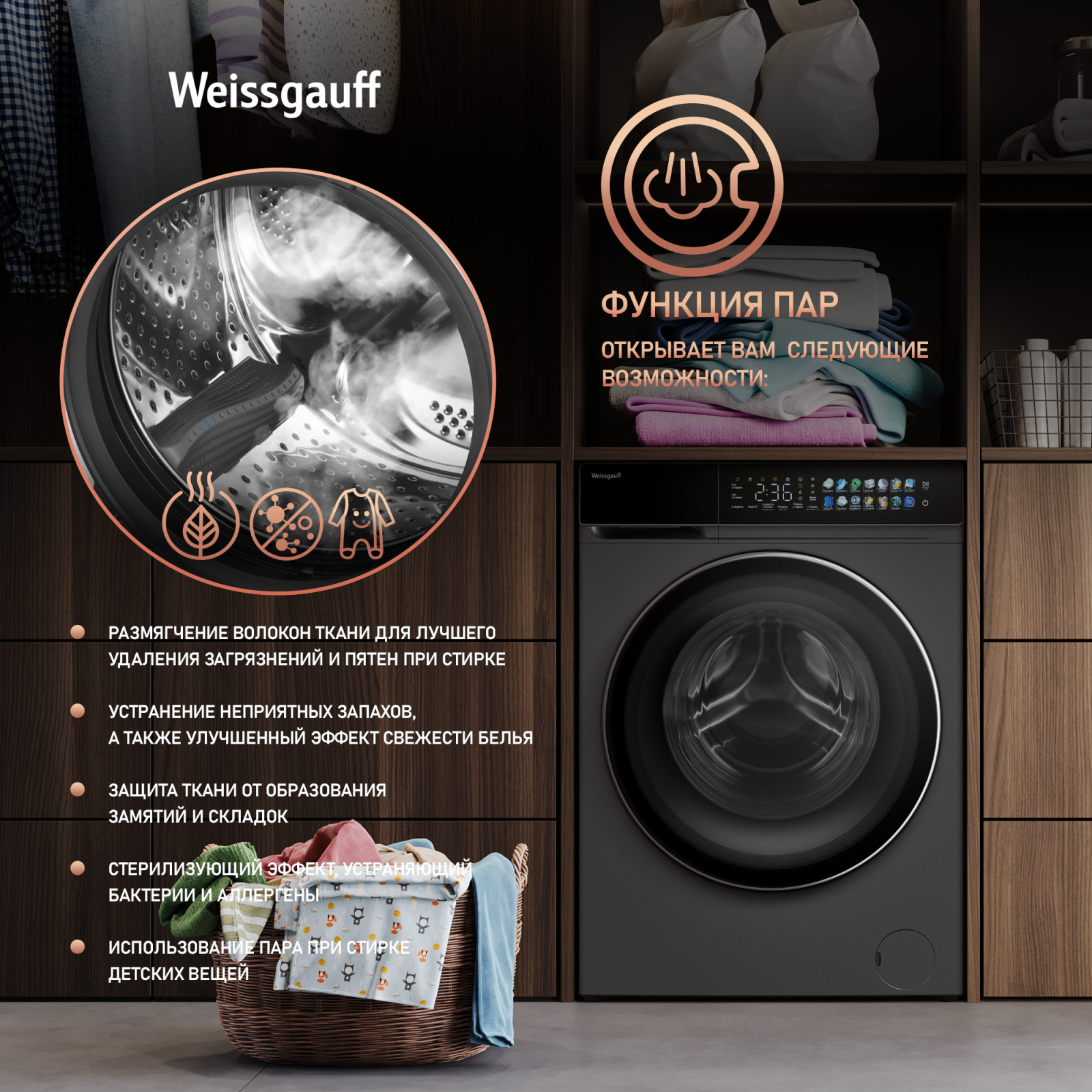 | Дезинфекция | Высокая температура пара уничтожает бактерии и микробы. | Гигиеническая стирка, особенно для детских вещей. |